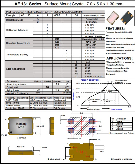 Anderson安德森晶振,AE-131-B-2-4085-2-18-26M0000,計(jì)算機(jī)6G晶振,AE131無源晶振,7050mm石英晶振,參數(shù)表