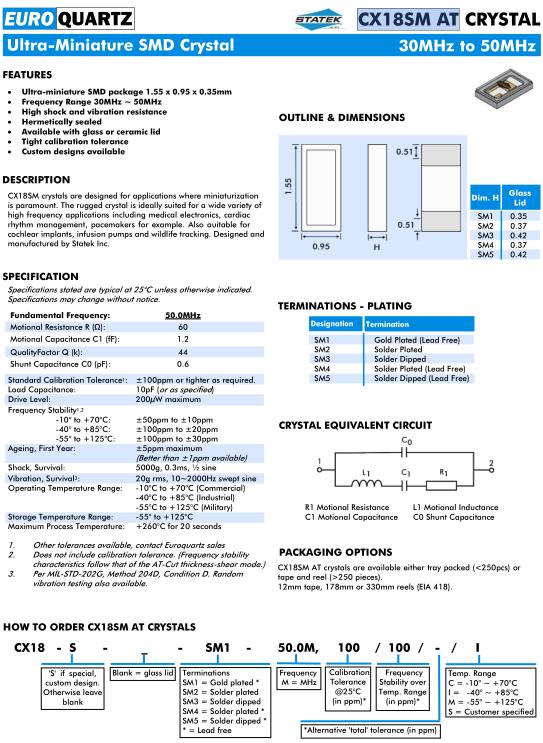 Euroquartz晶振,CX18SMAT晶振,CX18S-SM1-50.0M,100/100/I晶振,貼片晶振本身體積小,超薄型石英晶體振蕩器,特別適用于有目前高速發展的高端電子數碼產品,因為晶振本身小型化需求的市場領域,小型,薄型是對應陶瓷振蕩器(偏差大)和普通的石英晶體振蕩器(偏差小)的中間領域的一種性價比較出色的產品.產品廣泛用于筆記本電腦,無線電話,衛星導航SSD,USB,Blu-ray等用途,符合無鉛焊接的高溫回流焊曲線特性.