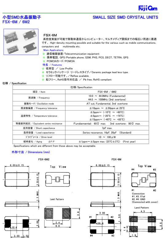 Fujicom晶振,FSX-6M晶振,6035mm晶振,小型貼片石英晶振,外觀尺寸具有薄型表面貼片型石英晶體振蕩器,特別適用于有小型化要求的市場領(lǐng)域,比如智能手機,無線藍牙,平板電腦等電子數(shù)碼產(chǎn)品.晶振本身超小型,薄型,重量輕,晶體具有優(yōu)良的耐環(huán)境特性,如耐熱性,耐沖擊性,在辦公自動化,家電相關(guān)電器領(lǐng)域及Bluetooth,WirelessLAN等短距離無線通信領(lǐng)域可發(fā)揮優(yōu)良的電氣特性,滿足無鉛焊接的回流溫度曲線要求.