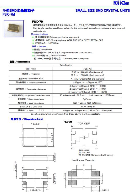 富士通晶振,FSX-7M晶振,SMD晶振,貼片晶振本身體積小,超薄型石英晶體振蕩器,特別適用于有目前高速發展的高端電子數碼產品,因為晶振本身小型化需求的市場領域,小型,薄型是對應陶瓷振蕩器(偏差大)和普通的石英晶體振蕩器(偏差小)的中間領域的一種性價比較出色的產品.產品廣泛用于筆記本電腦,無線電話,衛星導航SSD,USB,Blu-ray等用途,符合無鉛焊接的高溫回流焊曲線特性.
