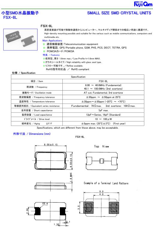 Fujicom晶振,FSX-8L晶振,8MHZ晶振,貼片晶振本身體積小,超薄型石英晶體振蕩器,特別適用于有目前高速發展的高端電子數碼產品,因為晶振本身小型化需求的市場領域,小型,薄型是對應陶瓷振蕩器(偏差大)和普通的石英晶體振蕩器(偏差小)的中間領域的一種性價比較出色的產品.產品廣泛用于筆記本電腦,無線電話,衛星導航SSD,USB,Blu-ray等用途,符合無鉛焊接的高溫回流焊曲線特性.