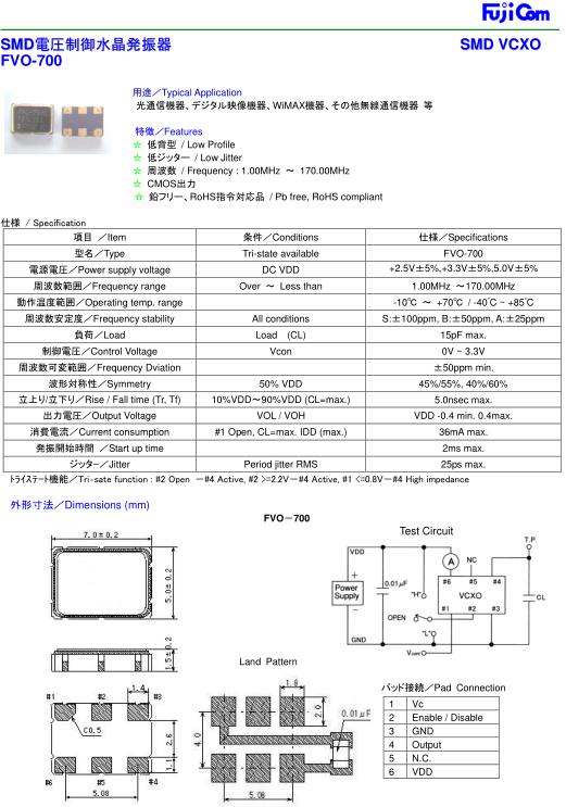 Fujicom晶振,FVO-700晶振,VCXO壓控晶振,小型SMD有源晶振,從最初超大體積到現(xiàn)在的7050mm,6035mm,5032mm,3225mm,2520mm體積,有著翻天覆地的改變,體積的變小也使產(chǎn)品帶來了更高的穩(wěn)定性能,接縫密封石英晶體振蕩器,精度高,覆蓋頻率范圍寬的特點,SMD高速自動安裝和高溫回流焊設(shè)計,Optionable待機(jī)輸出三態(tài)輸出功能,電源電壓范圍:1.8V~5V,高穩(wěn)定性,低抖動,低功耗,主要應(yīng)用領(lǐng)域:無線通訊,高端智能手機(jī),平板筆記本W(wǎng)LAN,藍(lán)牙,數(shù)碼相機(jī),DSL和其他IT產(chǎn)品的晶振應(yīng)用,三態(tài)功能,PC和LCDM等高端數(shù)碼領(lǐng)域,符合RoHS/無鉛.