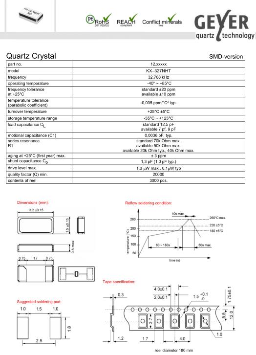 Geyer晶振,KX-327NHT晶振,環(huán)保晶振,32.768K時鐘晶體具有小型,薄型,輕型的貼片晶振表面音叉型晶體振蕩器,產(chǎn)品具有優(yōu)良的耐熱性,耐環(huán)境特性,可發(fā)揮晶振優(yōu)良的電氣特性,符合RoHS規(guī)定,滿足無鉛焊接的高溫回流溫度曲線要求,金屬外殼的封裝使得產(chǎn)品在封裝時能發(fā)揮比陶瓷振蕩器外殼更好的耐沖擊性.