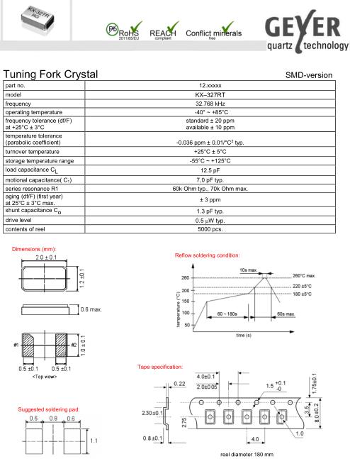 Geyer晶振,KX-327RT晶振,2012mm無源晶振,貼片表晶32.768K系列具有超小型,薄型,質地輕的表面貼片音叉型石英晶體振蕩器,晶振產品本身具備優良的耐熱性,耐環境特性,在辦公自動化,家電領域,移動通信領域可發揮優良的電氣特性,符合無鉛標準,滿足無鉛焊接的回流溫度曲線要求,金屬外殼的石英晶振使得產品在封裝時能發揮比陶瓷晶振外殼更好的耐沖擊性能.
