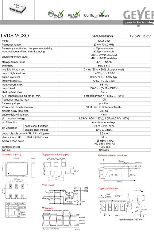 Geyer晶振,KXO-V62晶振,5032mm有源晶振,5032mm體積的石英晶體振蕩器,有源晶振,該產品可驅動2.5V的溫補晶振,壓控晶振,VC-TCXO晶體振蕩器產品,電源電壓的低電耗型,編帶包裝方式,可對應自動高速貼片機自動焊接,及IR回流焊接(無鉛對應),為無鉛產品,超小型,質地輕.產品被廣泛應用到集成電路,程控交換系統,無線發射基站.