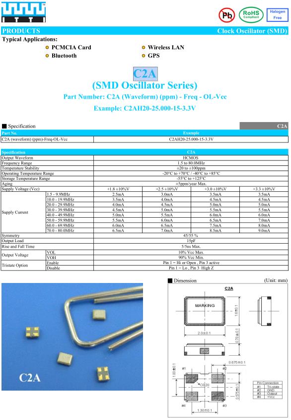 ITTI晶振,C2A晶振,C2AH20-26.000-15-3.3V晶振,2016mm體積的振蕩器,是目前有源晶振中體積最小的一款,產品本身帶溫度補償作用的晶體振蕩器,該體積產品最適合于GPS,以及衛星通訊系統,智能電話等多用途的高穩定的頻率溫度特性晶振.為對應低電源電壓的產品.