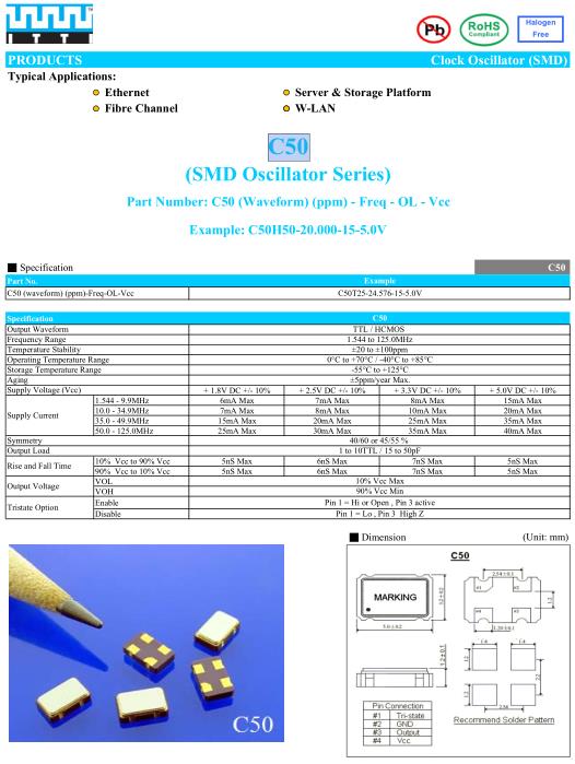 ITTI晶振,C50晶振,C50T25-24.000-15-5.0V晶振,5032mm體積的石英晶體振蕩器,有源晶振,該產品可驅動2.5V的溫補晶振,壓控晶振,VC-TCXO晶體振蕩器產品,電源電壓的低電耗型,編帶包裝方式,可對應自動高速貼片機自動焊接,及IR回流焊接(無鉛對應),為無鉛產品,超小型,質地輕.產品被廣泛應用到集成電路,程控交換系統,無線發射基站.