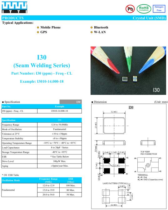 ITTI晶振,I30晶振,I3010-12.000-18晶振,超小型表面貼片型SMD晶振,最適合使用在汽車(chē)電子領(lǐng)域中,也是特別要求高可靠性的引擎控制用CPU的時(shí)鐘部分.低頻晶振可從7.98MHz起對(duì)應(yīng),小型,超薄型具備強(qiáng)防焊裂性,石英晶體在極端嚴(yán)酷的環(huán)境條件下也能發(fā)揮穩(wěn)定的起振特性,產(chǎn)品本身具有耐熱,耐振,耐撞擊等優(yōu)良的耐環(huán)境特性,滿足無(wú)鉛焊接以及高溫回流溫度曲線要求,符合AEC-Q200標(biāo)準(zhǔn).