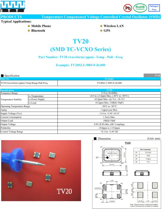 ITTI晶振,TV20晶振,TV20S2.5-3085-9-26.000晶振,有源晶振,是指晶體本身起振需要外部電壓供應,起振后可直接驅動CMOS集成電路,產品本身已實現與薄型IC(TSSOP封裝,TVSOP封裝)同樣的1mm厚度,斷開時的消費電流是15µA以下,編帶包裝方式可對應自動搭載及IR回流焊接(無鉛對應)產品有幾種電壓供選1.8V,2.5V,3V3.3V,5V,以應對不同IC產品需要.