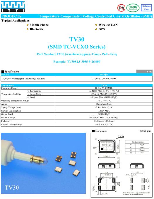 ITTI晶振,TV30晶振,TV30S2.5-3085-9-26.000晶振,小型SMD有源晶振,從最初超大體積到現(xiàn)在的7050mm,6035mm,5032mm,3225mm,2520mm體積,有著翻天覆地的改變,體積的變小也使產(chǎn)品帶來了更高的穩(wěn)定性能,接縫密封石英晶體振蕩器,精度高,覆蓋頻率范圍寬的特點,SMD高速自動安裝和高溫回流焊設(shè)計,Optionable待機輸出三態(tài)輸出功能,電源電壓范圍:1.8V~5V,高穩(wěn)定性,低抖動,低功耗,主要應(yīng)用領(lǐng)域:無線通訊,高端智能手機,平板筆記本W(wǎng)LAN,藍牙,數(shù)碼相機,DSL和其他IT產(chǎn)品的晶振應(yīng)用,三態(tài)功能,PC和LCDM等高端數(shù)碼領(lǐng)域,符合RoHS/無鉛.