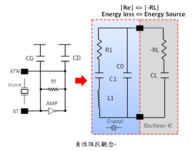 石英晶體共振子的兩端往振蕩電路看過去,排除共振子以外的所有阻抗特性質總和,振蕩電路上必須提供足夠大的增益來補償共振子共振時的機械能損耗,也就是放大器為一個能量源,若負性阻抗的能量源大于振蕩電路的損耗時,能源回路為平衡狀態此回路為穩定振蕩,負性阻抗不是產品規格參數,但卻是振蕩線路設計時很重要的性能指針.