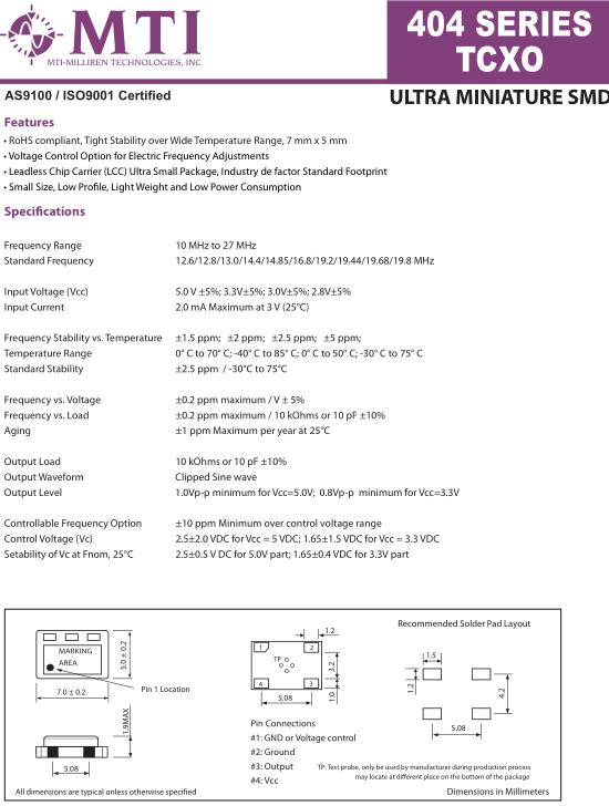 MTI晶振,404晶振,TCXO溫補晶振,小型SMD有源晶振,從最初超大體積到現(xiàn)在的7050mm,6035mm,5032mm,3225mm,2520mm體積,有著翻天覆地的改變,體積的變小也使產(chǎn)品帶來了更高的穩(wěn)定性能,接縫密封石英晶體振蕩器,精度高,覆蓋頻率范圍寬的特點,SMD高速自動安裝和高溫回流焊設計,Optionable待機輸出三態(tài)輸出功能,電源電壓范圍:1.8V~5V,高穩(wěn)定性,低抖動,低功耗,主要應用領域:無線通訊,高端智能手機,平板筆記本W(wǎng)LAN,藍牙,數(shù)碼相機,DSL和其他IT產(chǎn)品的晶振應用,三態(tài)功能,PC和LCDM等高端數(shù)碼領域,符合RoHS/無鉛.