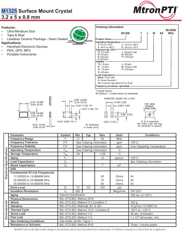 MtronPTI晶振,M1325晶振,M13251JMXX26.0000MHz晶振,智能手機(jī)晶振,產(chǎn)品具有高精度超小型的表面貼片型石英晶體振蕩器,最適用于移動(dòng)通信終端的基準(zhǔn)時(shí)鐘等移動(dòng)通信領(lǐng)域.比如智能手機(jī),無(wú)線通信,衛(wèi)星導(dǎo)航,平臺(tái)基站等較高端的數(shù)碼產(chǎn)品,晶振本身小型,薄型具備各類移動(dòng)通信的基準(zhǔn)時(shí)鐘源用頻率,貼片晶振具有優(yōu)良的電氣特性,耐環(huán)境性能適用于移動(dòng)通信領(lǐng)域,滿足無(wú)鉛焊接的高溫回流溫度曲線要求.