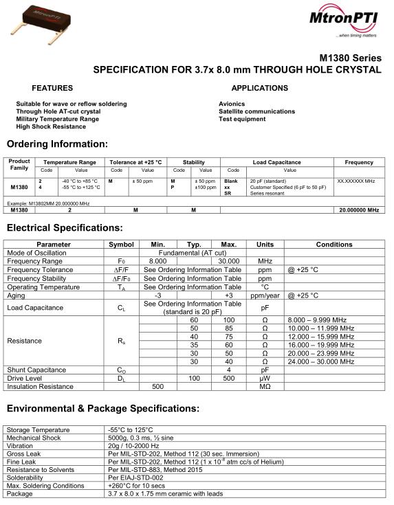 MtronPTI晶振,M1380晶振,M13802MM20.000000MHz晶振,貼片晶振本身體積小,超薄型石英晶體振蕩器,特別適用于有目前高速發展的高端電子數碼產品,因為晶振本身小型化需求的市場領域,小型,薄型是對應陶瓷振蕩器(偏差大)和普通的石英晶體振蕩器(偏差小)的中間領域的一種性價比較出色的產品.產品廣泛用于筆記本電腦,無線電話,衛星導航SSD,USB,Blu-ray等用途,符合無鉛焊接的高溫回流焊曲線特性.