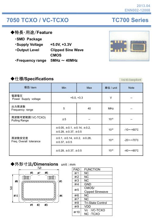 NAKA晶振,TC700晶振,TCXO溫補晶振,小型SMD有源晶振,從最初超大體積到現在的7050mm,6035mm,5032mm,3225mm,2520mm體積,有著翻天覆地的改變,體積的變小也使產品帶來了更高的穩定性能,接縫密封石英晶體振蕩器,精度高,覆蓋頻率范圍寬的特點,SMD高速自動安裝和高溫回流焊設計,Optionable待機輸出三態輸出功能,電源電壓范圍:1.8V~5V,高穩定性,低抖動,低功耗,主要應用領域:無線通訊,高端智能手機,平板筆記本WLAN,藍牙,數碼相機,DSL和其他IT產品的晶振應用,三態功能,PC和LCDM等高端數碼領域,符合RoHS/無鉛.