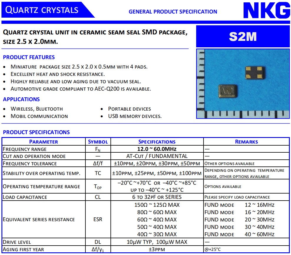 S2M16.0000T18E23-EXT,NKG諧振器,6G無線網絡晶振,S2M20.0000T18F2Y-EXT,石英貼片晶振,參數表