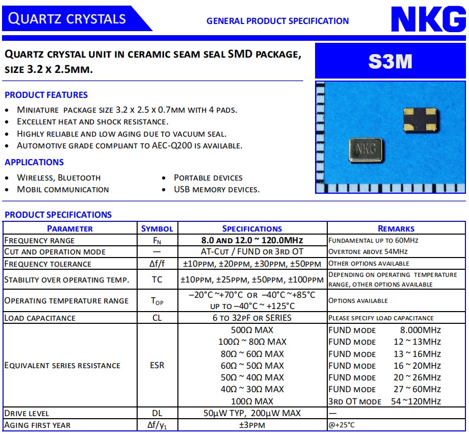 NKG高性能晶振,S3M60.0000F18E23-EXT,USB內存設備6G晶振,S3M54.0000T18M1Z-EXT,車載控制器晶振,參數表