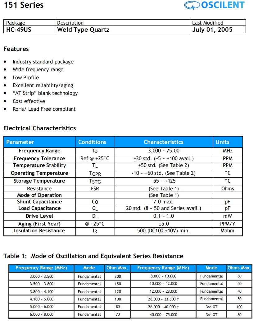 奧斯康利石英晶體,151-12.000M-SR-05-HP-VS,6G通信晶振 參數(shù)表