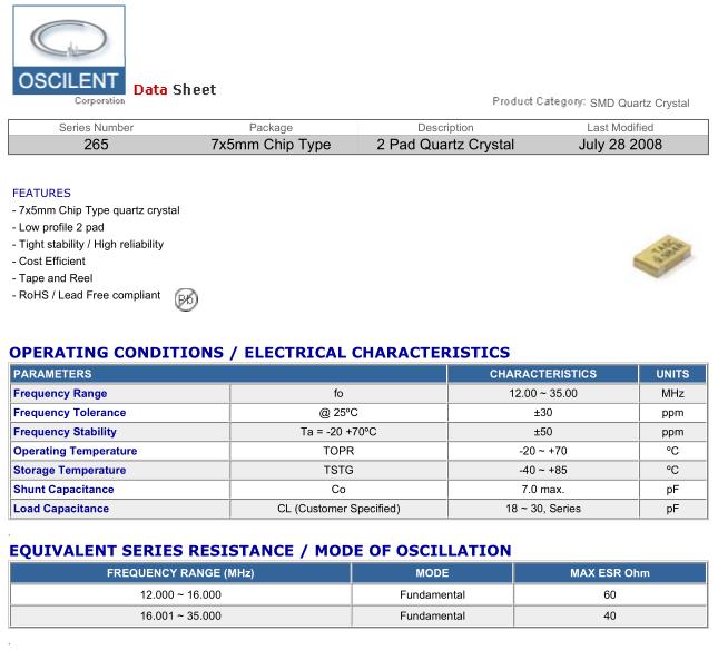Oscilent晶振擁有頂尖的頻率元件制造技術,Oscilent Crystal公司主打的石英晶體,有源晶振,陶瓷諧振器和聲表濾波器在市場上非常受歡迎,每一顆Oscilent貼片晶振都是精品.Oscilent晶振,265-12.0M-20-S-TR晶振,7050mm晶振.