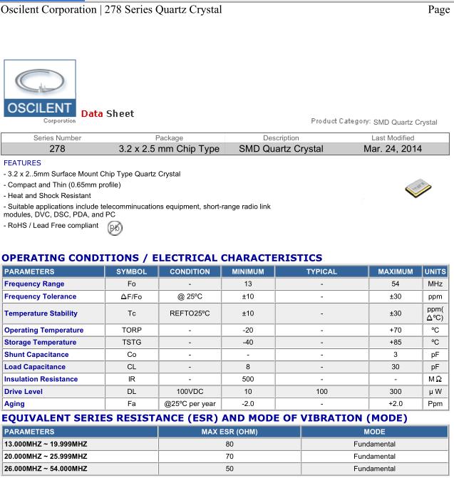 Oscilent晶振,278-25.0M-20-W-TR晶振,高品質晶振,超小型表面貼片型SMD晶振,最適合使用在汽車電子領域中,也是特別要求高可靠性的引擎控制用CPU的時鐘部分.低頻晶振可從7.98MHz起對應,小型,超薄型具備強防焊裂性,石英晶體在極端嚴酷的環境條件下也能發揮穩定的起振特性,產品本身具有耐熱,耐振,耐撞擊等優良的耐環境特性,滿足無鉛焊接以及高溫回流溫度曲線要求,符合AEC-Q200標準.