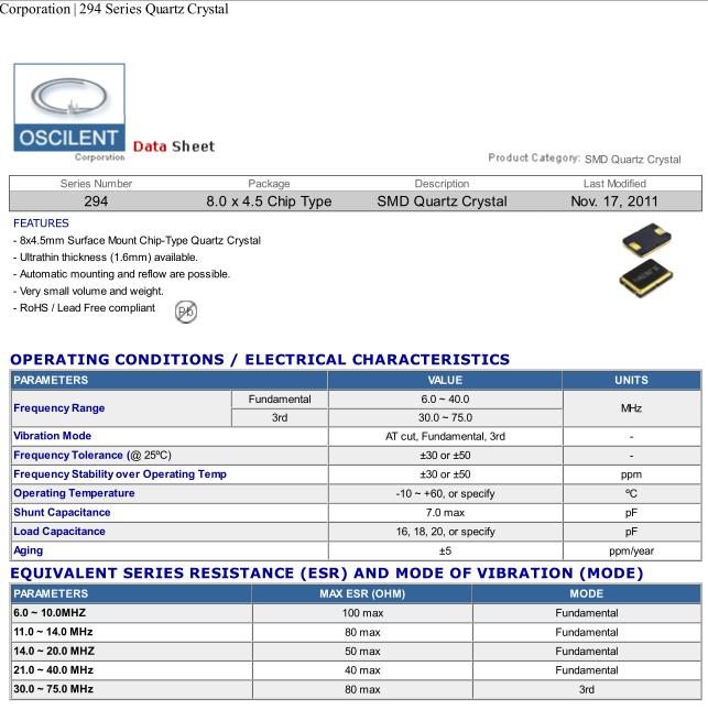 Oscilent晶振,294-10.0M-20GR-TR晶振,無源貼片晶振,貼片晶振本身體積小,超薄型石英晶體振蕩器,特別適用于有目前高速發(fā)展的高端電子數(shù)碼產(chǎn)品,因?yàn)榫д癖旧硇⌒突枨蟮氖袌鲱I(lǐng)域,小型,薄型是對應(yīng)陶瓷振蕩器(偏差大)和普通的石英晶體振蕩器(偏差小)的中間領(lǐng)域的一種性價(jià)比較出色的產(chǎn)品.產(chǎn)品廣泛用于筆記本電腦,無線電話,衛(wèi)星導(dǎo)航SSD,USB,Blu-ray等用途,符合無鉛焊接的高溫回流焊曲線特性.