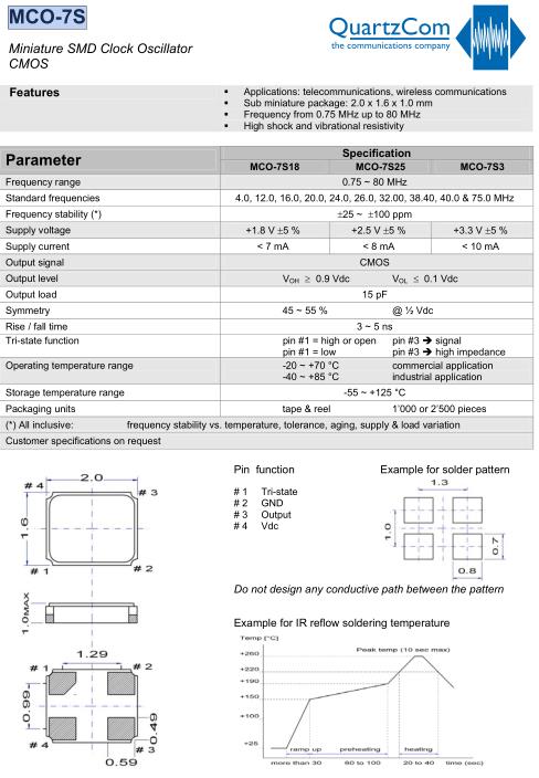 QuartzCom晶振,MCO-7S18晶振,SMD時鐘振蕩器,小型SMD有源晶振,從最初超大體積到現在的7050mm,6035mm,5032mm,3225mm,2520mm體積,有著翻天覆地的改變,體積的變小也使產品帶來了更高的穩定性能,接縫密封石英晶體振蕩器,精度高,覆蓋頻率范圍寬的特點,SMD高速自動安裝和高溫回流焊設計,Optionable待機輸出三態輸出功能,電源電壓范圍:1.8V~5V,高穩定性,低抖動,低功耗,主要應用領域:無線通訊,高端智能手機,平板筆記本WLAN,藍牙,數碼相機,DSL和其他IT產品的晶振應用,三態功能,PC和LCDM等高端數碼領域,符合RoHS/無鉛.