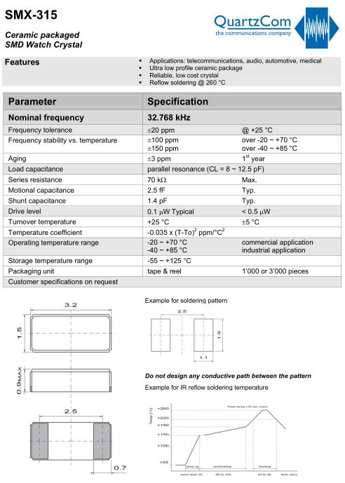 QuartzCom晶振,SMX-315晶振,SMD晶振,貼片表晶32.768K系列具有超小型,薄型,質地輕的表面貼片音叉型石英晶體振蕩器,晶振產品本身具備優良的耐熱性,耐環境特性,在辦公自動化,家電領域,移動通信領域可發揮優良的電氣特性,符合無鉛標準,滿足無鉛焊接的回流溫度曲線要求,金屬外殼的石英晶振使得產品在封裝時能發揮比陶瓷晶振外殼更好的耐沖擊性能.