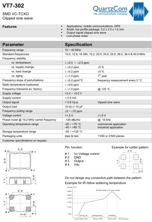 QuartzCom晶振,VT7-302晶振,VC-TCXO晶振,小型SMD有源晶振,從最初超大體積到現在的7050mm,6035mm,5032mm,3225mm,2520mm體積,有著翻天覆地的改變,體積的變小也使產品帶來了更高的穩定性能,接縫密封石英晶體振蕩器,精度高,覆蓋頻率范圍寬的特點,SMD高速自動安裝和高溫回流焊設計,Optionable待機輸出三態輸出功能,電源電壓范圍:1.8V~5V,高穩定性,低抖動,低功耗,主要應用領域:無線通訊,高端智能手機,平板筆記本WLAN,藍牙,數碼相機,DSL和其他IT產品的晶振應用,三態功能,PC和LCDM等高端數碼領域,符合RoHS/無鉛.
