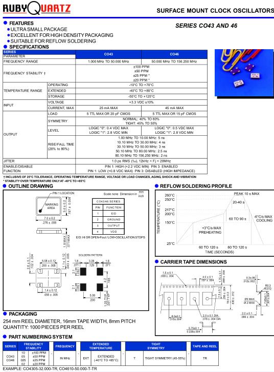 Rubyquartz晶振,CO43晶振,CO4305-26.000-TR晶振,小型SMD有源晶振,從最初超大體積到現(xiàn)在的7050mm,6035mm,5032mm,3225mm,2520mm體積,有著翻天覆地的改變,體積的變小也使產(chǎn)品帶來了更高的穩(wěn)定性能,接縫密封石英晶體振蕩器,精度高,覆蓋頻率范圍寬的特點,SMD高速自動安裝和高溫回流焊設(shè)計,Optionable待機(jī)輸出三態(tài)輸出功能,電源電壓范圍:1.8V~5V,高穩(wěn)定性,低抖動,低功耗,主要應(yīng)用領(lǐng)域:無線通訊,高端智能手機(jī),平板筆記本W(wǎng)LAN,藍(lán)牙,數(shù)碼相機(jī),DSL和其他IT產(chǎn)品的晶振應(yīng)用,三態(tài)功能,PC和LCDM等高端數(shù)碼領(lǐng)域,符合RoHS/無鉛.