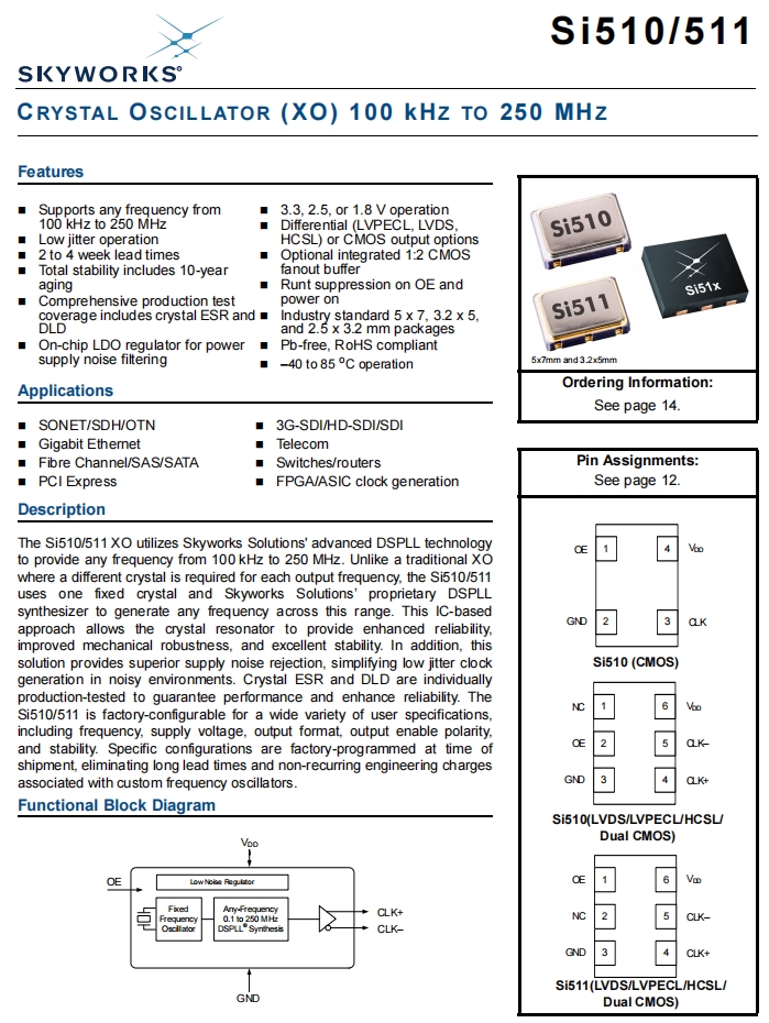 | 510BBA200M000AAG | Skyworks有源晶振 | XTAL OSC XO 200.0000MHZ LVDS SMD | Si510 | 200 MHz | LVDS |