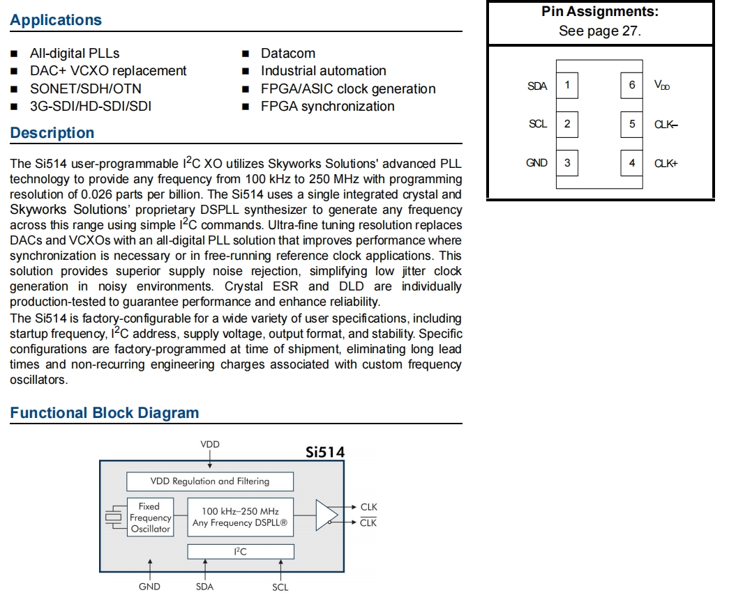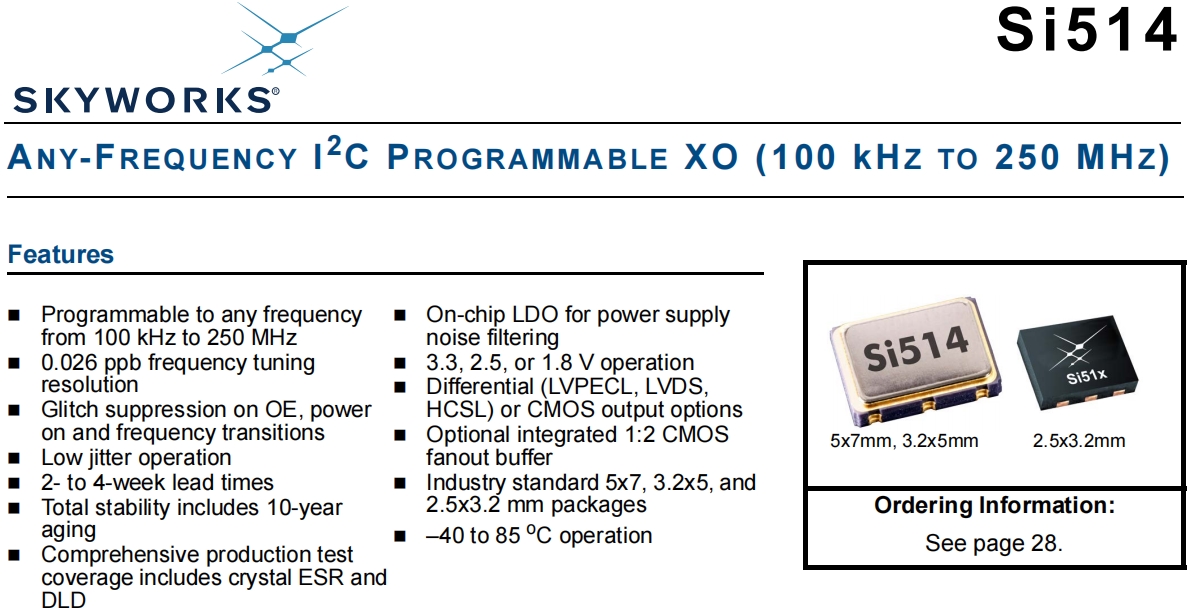 | 514JCA000126CAGR | Skyworks有源晶振 | DIFFERENTIAL/SINGLE-ENDED; I2C P | Si514 | 200 MHz | LVDS |