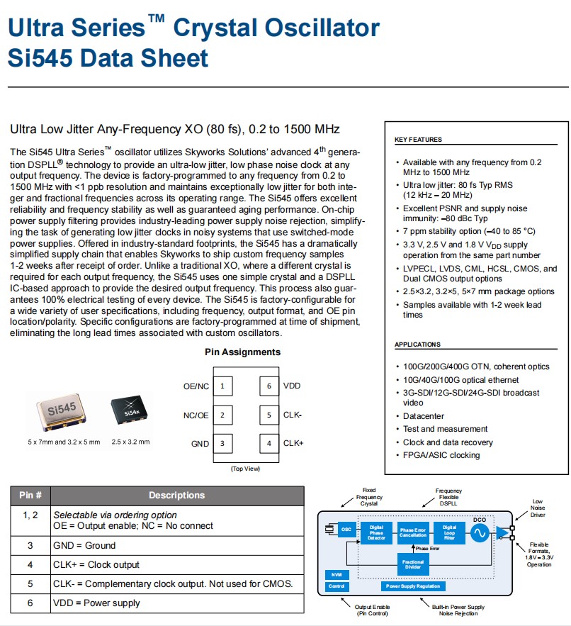 | 545BAA200M000BBG | Skyworks晶振 | Si545 | 200 MHz | LVDS | 1.8V, 2.5V, 3.3V |