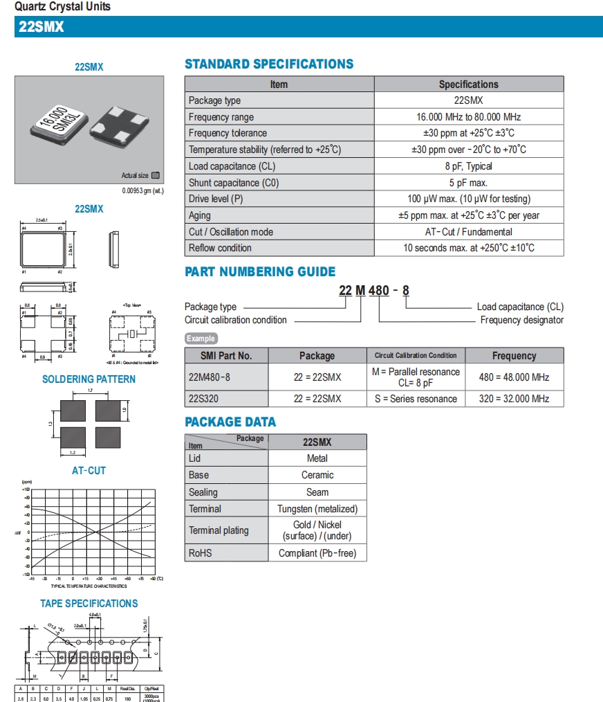 22SMX輕薄型晶振,22M360-8,6GWIFI晶振,SMI石英諧振器 參數表