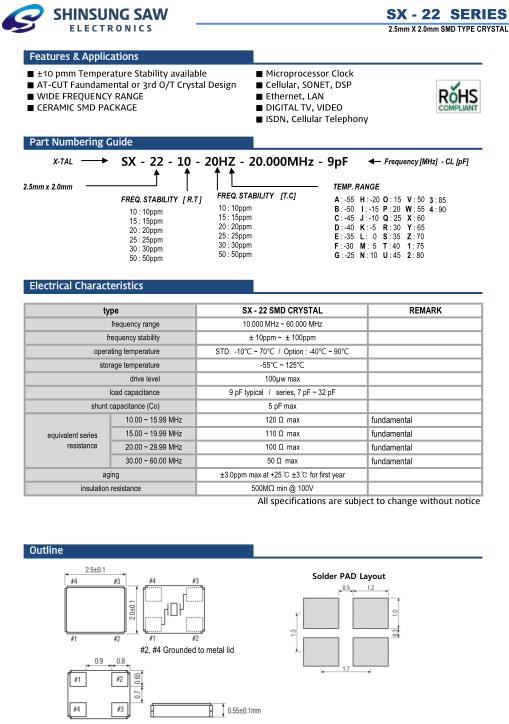 Shinsung晶振,SX-22晶振,SX-22-10-20HZ-20.000MHz-9pF晶振,小型貼片石英晶振,外觀尺寸具有薄型表面貼片型石英晶體振蕩器,特別適用于有小型化要求的市場(chǎng)領(lǐng)域,比如智能手機(jī),無(wú)線藍(lán)牙,平板電腦等電子數(shù)碼產(chǎn)品.晶振本身超小型,薄型,重量輕,晶體具有優(yōu)良的耐環(huán)境特性,如耐熱性,耐沖擊性,在辦公自動(dòng)化,家電相關(guān)電器領(lǐng)域及Bluetooth,WirelessLAN等短距離無(wú)線通信領(lǐng)域可發(fā)揮優(yōu)良的電氣特性,滿足無(wú)鉛焊接的回流溫度曲線要求.