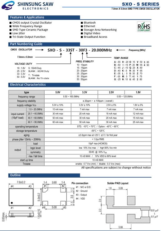Shinsung晶振,SXO-S晶振,SXO-S-33ST-30F3-20.000MHz晶振,小型SMD有源晶振,從最初超大體積到現在的7050mm,6035mm,5032mm,3225mm,2520mm體積,有著翻天覆地的改變,體積的變小也使產品帶來了更高的穩定性能,接縫密封石英晶體振蕩器,精度高,覆蓋頻率范圍寬的特點,SMD高速自動安裝和高溫回流焊設計,Optionable待機輸出三態輸出功能,電源電壓范圍:1.8V~5V,高穩定性,低抖動,低功耗,主要應用領域:無線通訊,高端智能手機,平板筆記本WLAN,藍牙,數碼相機,DSL和其他IT產品的晶振應用,三態功能,PC和LCDM等高端數碼領域,符合RoHS/無鉛.