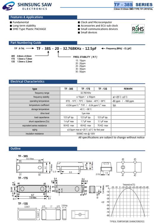 Shinsung晶振,TF-38S晶振,TF-38S-20-32.768KHz-12.5pF晶振,32.768K時鐘晶體具有小型,薄型,輕型的貼片晶振表面音叉型晶體振蕩器,產品具有優良的耐熱性,耐環境特性,可發揮晶振優良的電氣特性,符合RoHS規定,滿足無鉛焊接的高溫回流溫度曲線要求,金屬外殼的封裝使得產品在封裝時能發揮比陶瓷振蕩器外殼更好的耐沖擊性.