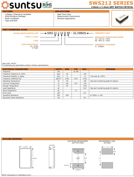 Suntsu晶振,SWS212晶振,SWS21212D48-32.768kHz晶振,32.768K時(shí)鐘晶體具有小型,薄型,輕型的貼片晶振表面音叉型晶體振蕩器,產(chǎn)品具有優(yōu)良的耐熱性,耐環(huán)境特性,可發(fā)揮晶振優(yōu)良的電氣特性,符合RoHS規(guī)定,滿足無(wú)鉛焊接的高溫回流溫度曲線要求,金屬外殼的封裝使得產(chǎn)品在封裝時(shí)能發(fā)揮比陶瓷振蕩器外殼更好的耐沖擊性.
