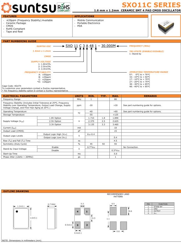 Suntsu晶振,SXO11C晶振,SXO11C3A481-20.000M晶振,小型SMD有源晶振,從最初超大體積到現在的7050mm,6035mm,5032mm,3225mm,2520mm體積,有著翻天覆地的改變,體積的變小也使產品帶來了更高的穩定性能,接縫密封石英晶體振蕩器,精度高,覆蓋頻率范圍寬的特點,SMD高速自動安裝和高溫回流焊設計,Optionable待機輸出三態輸出功能,電源電壓范圍:1.8V~5V,高穩定性,低抖動,低功耗,主要應用領域:無線通訊,高端智能手機,平板筆記本WLAN,藍牙,數碼相機,DSL和其他IT產品的晶振應用,三態功能,PC和LCDM等高端數碼領域,符合RoHS/無鉛.