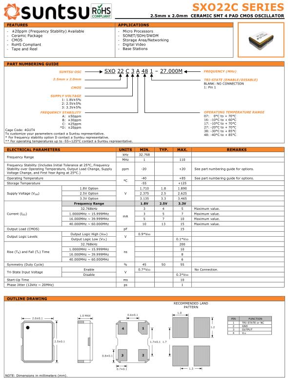 Suntsu晶振,SXO22C晶振,SXO22C3A481-26.000M晶振,有源晶振,是指晶體本身起振需要外部電壓供應,起振后可直接驅動CMOS集成電路,產品本身已實現與薄型IC(TSSOP封裝,TVSOP封裝)同樣的1mm厚度,斷開時的消費電流是15µA以下,編帶包裝方式可對應自動搭載及IR回流焊接(無鉛對應)產品有幾種電壓供選1.8V,2.5V,3V3.3V,5V,以應對不同IC產品需要.