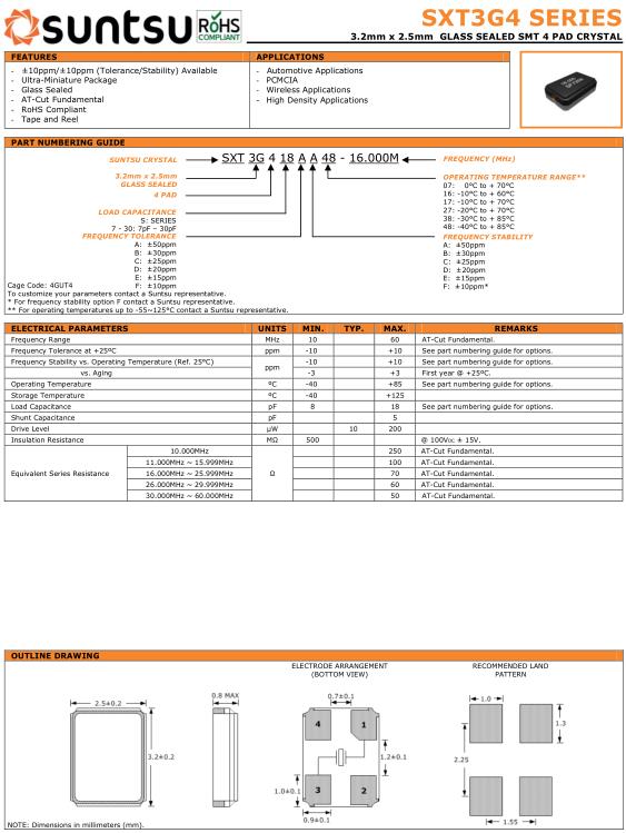 松圖晶振,SXT3G4晶振,SXT3G418AA48-16.000M晶振,小型貼片石英晶振,外觀尺寸具有薄型表面貼片型石英晶體振蕩器,特別適用于有小型化要求的市場領域,比如智能手機,無線藍牙,平板電腦等電子數碼產品.晶振本身超小型,薄型,重量輕,晶體具有優良的耐環境特性,如耐熱性,耐沖擊性,在辦公自動化,家電相關電器領域及Bluetooth,WirelessLAN等短距離無線通信領域可發揮優良的電氣特性,滿足無鉛焊接的回流溫度曲線要求.
