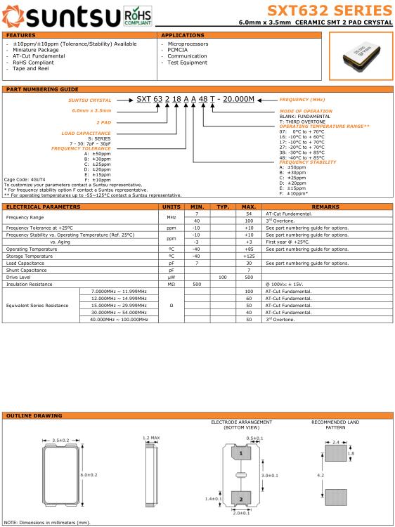 Suntsu晶振,SXT632晶振,SXT63218AA48T-20.000M晶振,貼片晶振本身體積小,超薄型石英晶體振蕩器,特別適用于有目前高速發展的高端電子數碼產品,因為晶振本身小型化需求的市場領域,小型,薄型是對應陶瓷振蕩器(偏差大)和普通的石英晶體振蕩器(偏差小)的中間領域的一種性價比較出色的產品.產品廣泛用于筆記本電腦,無線電話,衛星導航SSD,USB,Blu-ray等用途,符合無鉛焊接的高溫回流焊曲線特性.