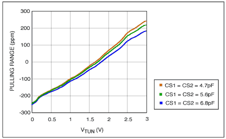 為了限制VCXO的調(diào)諧范圍,我們可以通過改變外部并聯(lián)電容來設(shè)置上限.并聯(lián)電容的值在4ps-7ps的范圍內(nèi),具體取決于電路板的寄生電容.另一方面,較低的范圍由內(nèi)部矢量的值確定,其不能在外部改變.為了減少寄生電容對(duì)上調(diào)諧范圍的影響,在電路板布局中,我們應(yīng)該盡量減小石英晶振引腳對(duì)地的寄生電容,從而在引腳與接地和電源方案之間提供良好的間隙.