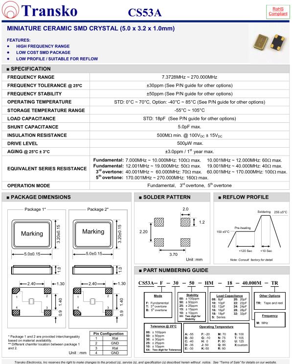 | SPECIFICATION-Transko晶振 | CS53A晶振 |