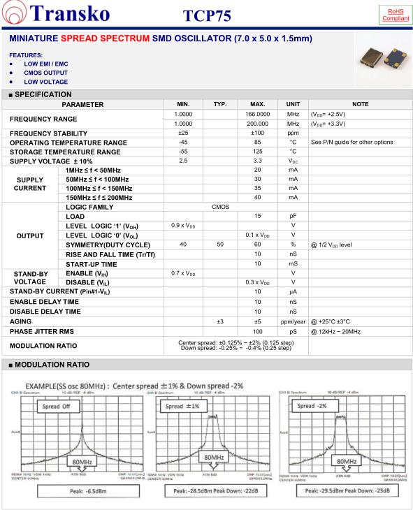 Transko晶振,TCP75晶振,TCP75-H50HM33SA-24.000M-TR晶振,小型SMD有源晶振,從最初超大體積到現(xiàn)在的7050mm,6035mm,5032mm,3225mm,2520mm體積,有著翻天覆地的改變,體積的變小也使產(chǎn)品帶來了更高的穩(wěn)定性能,接縫密封石英晶體振蕩器,精度高,覆蓋頻率范圍寬的特點,SMD高速自動安裝和高溫回流焊設(shè)計,Optionable待機輸出三態(tài)輸出功能,電源電壓范圍:1.8V~5V,高穩(wěn)定性,低抖動,低功耗,主要應(yīng)用領(lǐng)域:無線通訊,高端智能手機,平板筆記本W(wǎng)LAN,藍(lán)牙,數(shù)碼相機,DSL和其他IT產(chǎn)品的晶振應(yīng)用,三態(tài)功能,PC和LCDM等高端數(shù)碼領(lǐng)域,符合RoHS/無鉛.