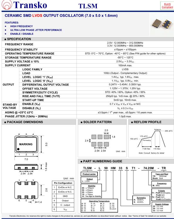 特蘭斯科晶振,TLSM晶振,TLSM-L50HM33ST1-12.000M-TR晶振,小型SMD有源晶振,從最初超大體積到現在的7050mm,6035mm,5032mm,3225mm,2520mm體積,有著翻天覆地的改變,體積的變小也使產品帶來了更高的穩定性能,接縫密封石英晶體振蕩器,精度高,覆蓋頻率范圍寬的特點,SMD高速自動安裝和高溫回流焊設計,Optionable待機輸出三態輸出功能,電源電壓范圍:1.8V~5V,高穩定性,低抖動,低功耗,主要應用領域:無線通訊,高端智能手機,平板筆記本WLAN,藍牙,數碼相機,DSL和其他IT產品的晶振應用,三態功能,PC和LCDM等高端數碼領域,符合RoHS/無鉛.