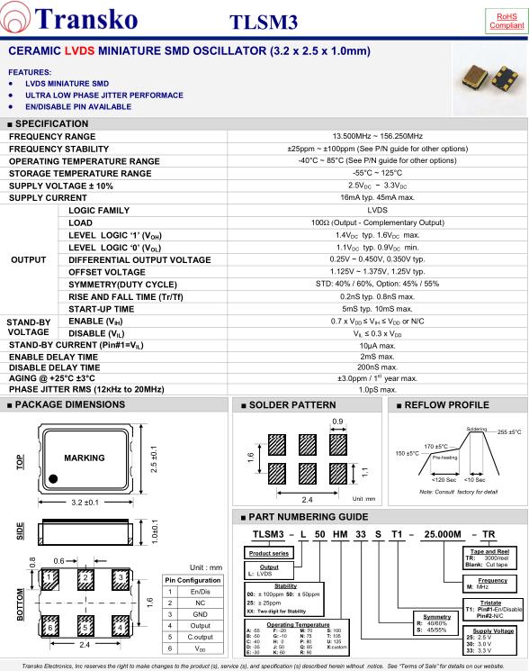 Transko晶振1993年在加利福尼亞州開設晶振生產工廠.為滿足客戶需求便以Transko晶振為公司品牌,開始生產成品石英晶體和石英晶體振蕩器,以及有源晶振等元件.Transko晶振,TLSM3晶振,TLSM3-L50HM33ST1-24.000M-TR晶振.