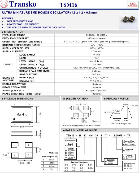 特蘭斯科晶振,TSM16晶振,TSM16-H50HM33ST-12.000M-TR晶振,小型SMD有源晶振,從最初超大體積到現在的7050mm,6035mm,5032mm,3225mm,2520mm體積,有著翻天覆地的改變,體積的變小也使產品帶來了更高的穩定性能,接縫密封石英晶體振蕩器,精度高,覆蓋頻率范圍寬的特點,SMD高速自動安裝和高溫回流焊設計,Optionable待機輸出三態輸出功能,電源電壓范圍:1.8V~5V,高穩定性,低抖動,低功耗,主要應用領域:無線通訊,高端智能手機,平板筆記本WLAN,藍牙,數碼相機,DSL和其他IT產品的晶振應用,三態功能,PC和LCDM等高端數碼領域,符合RoHS/無鉛.
