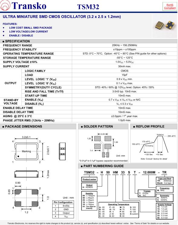 Transko晶振,TSM32晶振,TSM32-H50HM33ST-12.000-TR晶振,小型SMD有源晶振,從最初超大體積到現在的7050mm,6035mm,5032mm,3225mm,2520mm體積,有著翻天覆地的改變,體積的變小也使產品帶來了更高的穩定性能,接縫密封石英晶體振蕩器,精度高,覆蓋頻率范圍寬的特點,SMD高速自動安裝和高溫回流焊設計,Optionable待機輸出三態輸出功能,電源電壓范圍:1.8V~5V,高穩定性,低抖動,低功耗,主要應用領域:無線通訊,高端智能手機,平板筆記本WLAN,藍牙,數碼相機,DSL和其他IT產品的晶振應用,三態功能,PC和LCDM等高端數碼領域,符合RoHS/無鉛.