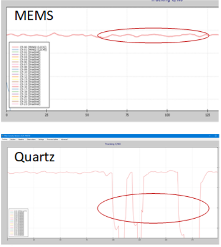 MEMS與石英相比,用于通過熱空氣流動和振動攻絲進行衛星跟蹤.石英失去了幾次跟蹤;MEMS保持穩定.