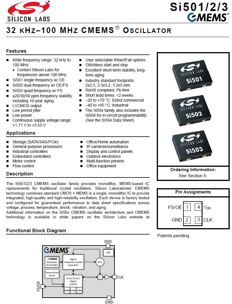 編碼501BCAM032768DAG,型號(hào)Si501,頻率為32.768KHZ,Si501/2/3CMEMS振蕩器系列提供基于mems的單片集成電路取代傳統(tǒng)晶體振蕩器。硅實(shí)驗(yàn)室的CMEMS技術(shù)結(jié)合了標(biāo)準(zhǔn)的CMOS+MEMS在一個(gè)單一的,單片IC提供集成,高品質(zhì)和高可靠性的SMD振蕩器。每個(gè)設(shè)備都經(jīng)過(guò)工廠(chǎng)測(cè)試并配置為保證性能的數(shù)據(jù)表規(guī)范跨越電壓、工藝、溫度、沖擊、振動(dòng)和老化。